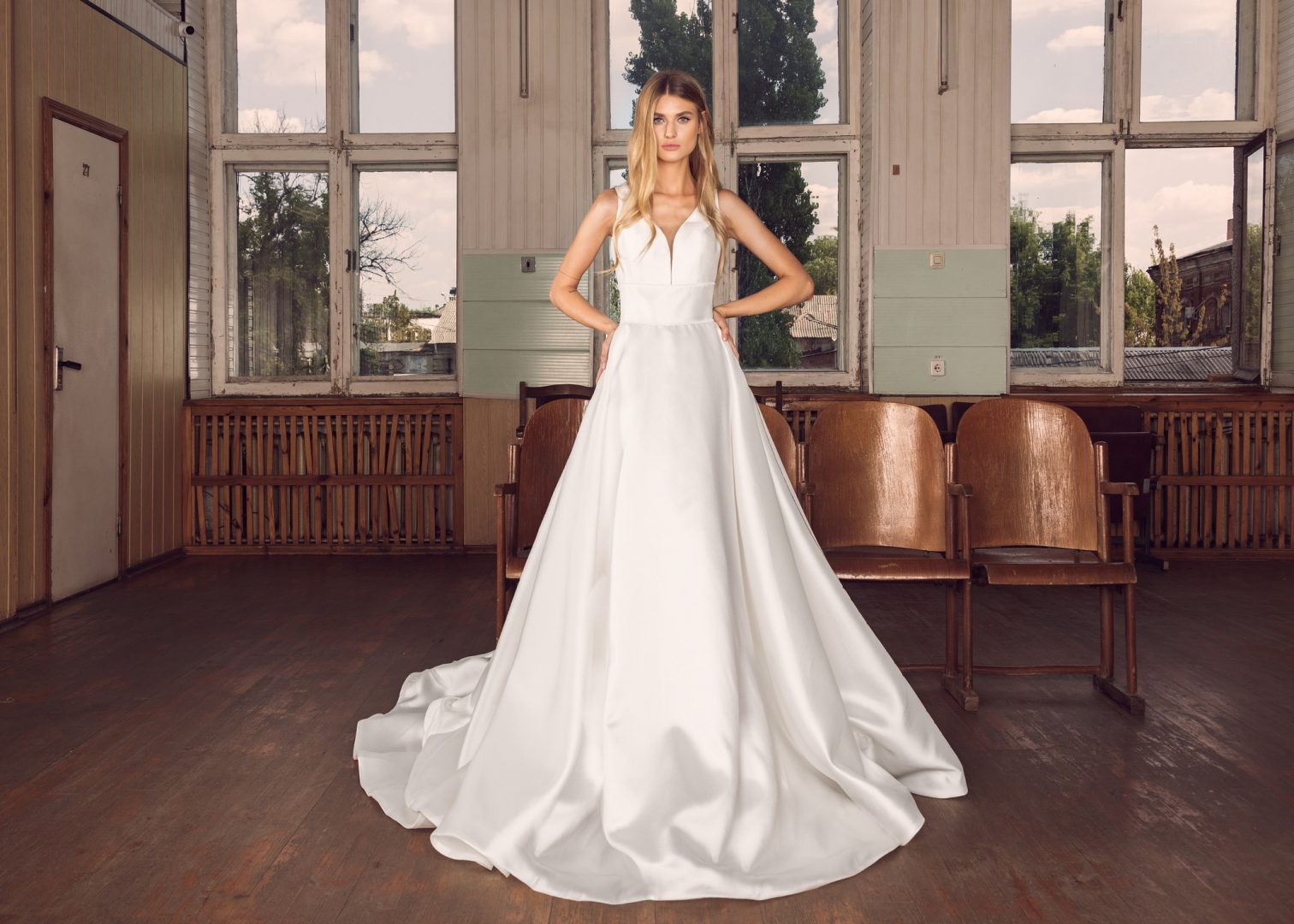 A classic Mikado satin, A-line wedidng dress featuring a V-neck and back , wide waistband and pockets.