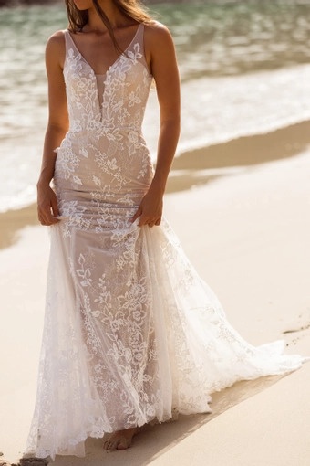 A slimline, fit and flare wedding dress featuring a plunging neckline, beautiful botanical lace and V-cut back.