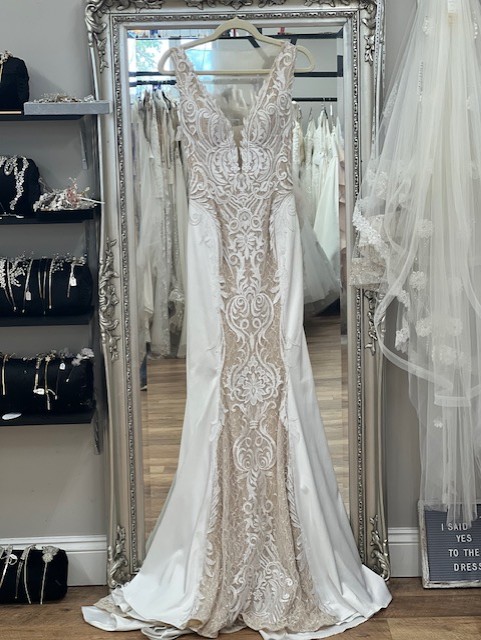 A glamorous, strapless mermaid wedding dress featuring stunning embroidered ivory and gold lace detail to the bodice and the bottom of the skirt.