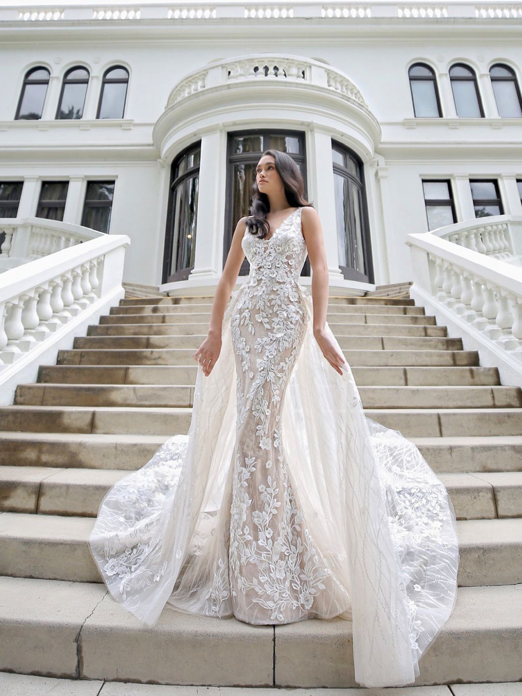An breath taking mermaid style wedding dress featuring 3D floral motifs, an under layer of sequinned tulle and a dramatic detachable overskirt.