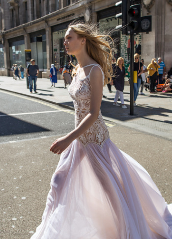 A fun and flirty wedding dress ideal for an informal wedding or a fun party dress. Featuring a beaded bodice, and a sheer tulle A-line skirt over a shorter mini underskirt.