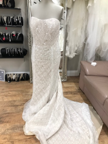 A glamorous, slim fitting, glitter encrusted wedding dress featuring cap sleeves, V-crossover bodice and a high leg split .