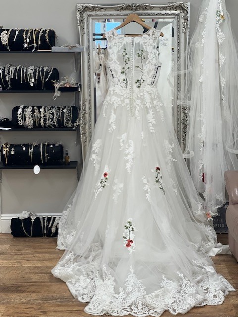 A classic, lace applique over tulle, A-line wedding dress featuring a sheer overlay to the sweetheart bodice and delicate wildflower embroidered accents.