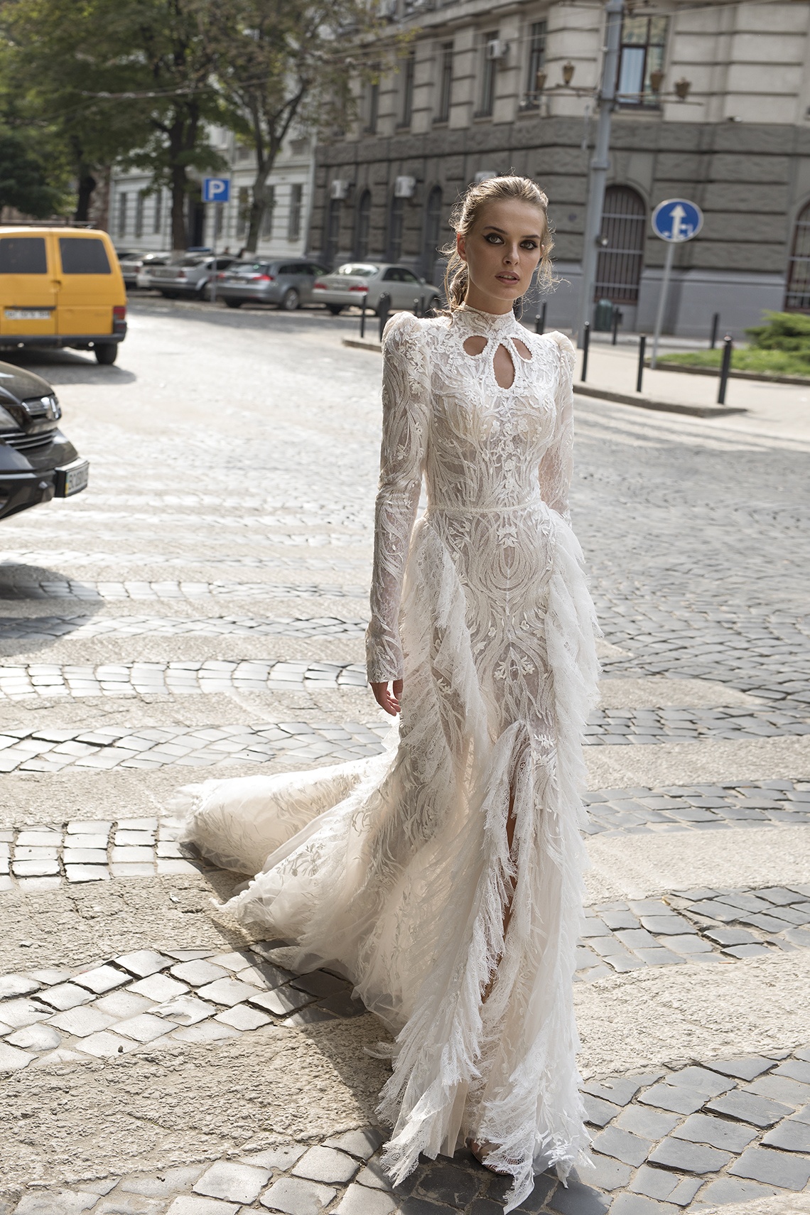 This high neck, lace wedding dress is a work of art. A fitted silhouette featuring cut out detail to the neckline, full length sleeves, ruffled accents and a high leg split.