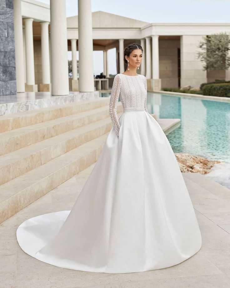 A classic soft satin, ballgown wedding dress featuring a structured bodice with clinched waist and a delicate lace overlay with full sleeves.