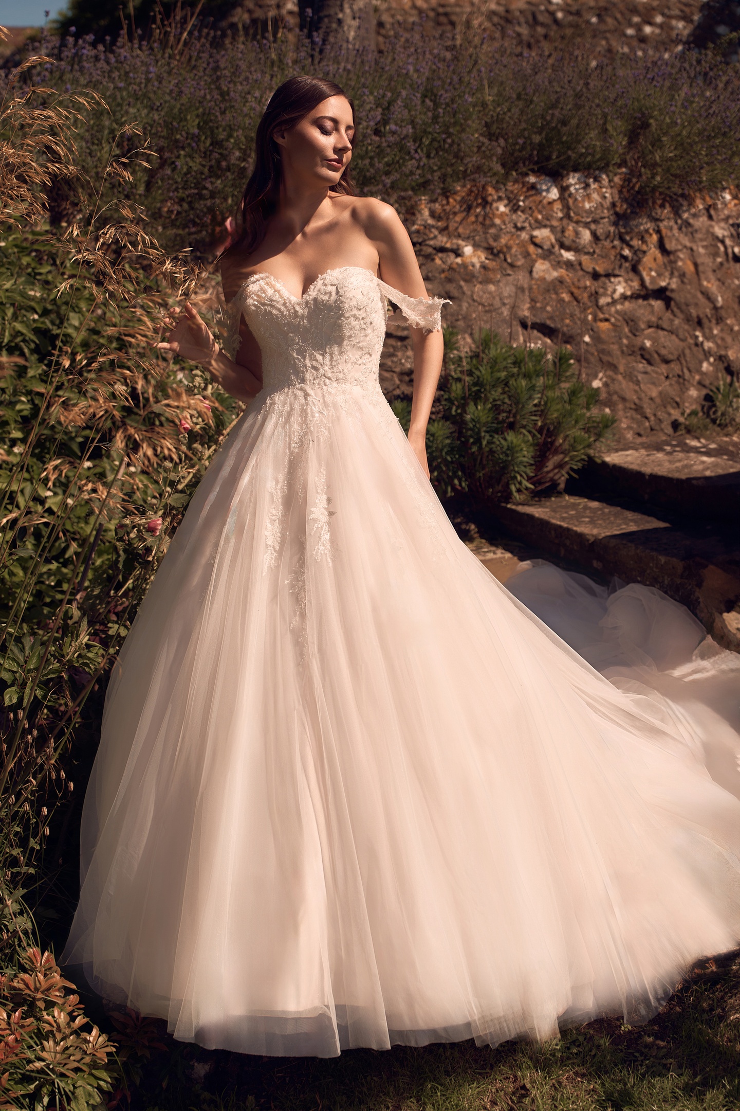 A beautiful ballgown wedding dress featuring beaded lace applique detail to the bodice, trailing down the full tulle skirt and off the shoulder straps.