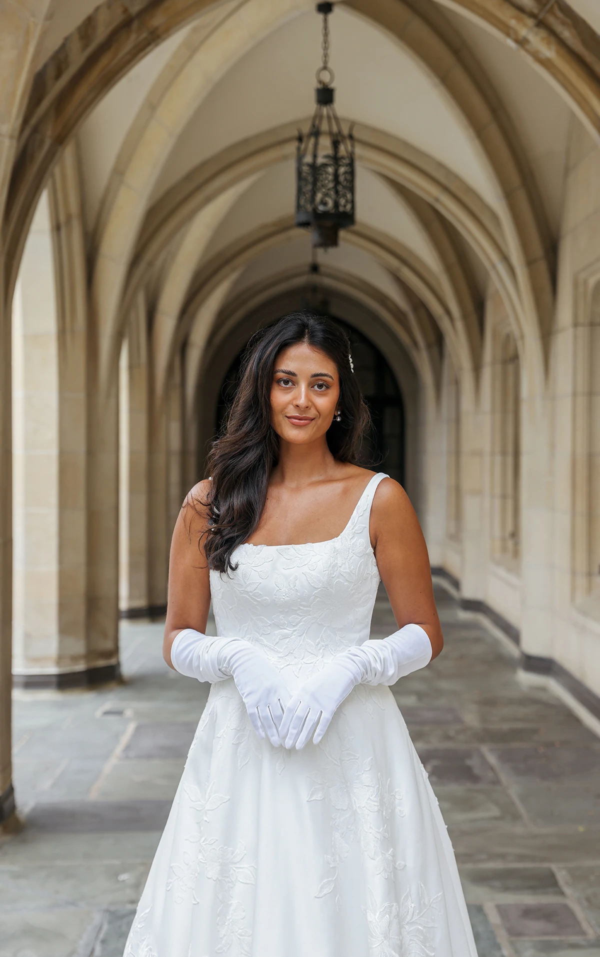 A flattering, contemporary, matt satin ballgown style wedding dress featuring bold embossed floral appliques, a square cut neckline and back and a fabulous full skirt.