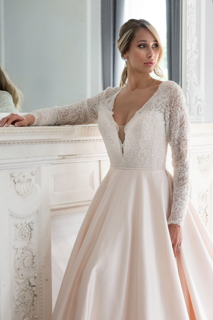 An elegant, A-line satin wedding dress featuring a plunge V-neck, full chiffon sleeves with button cuffs and a V cut back with subtle beaded trim.