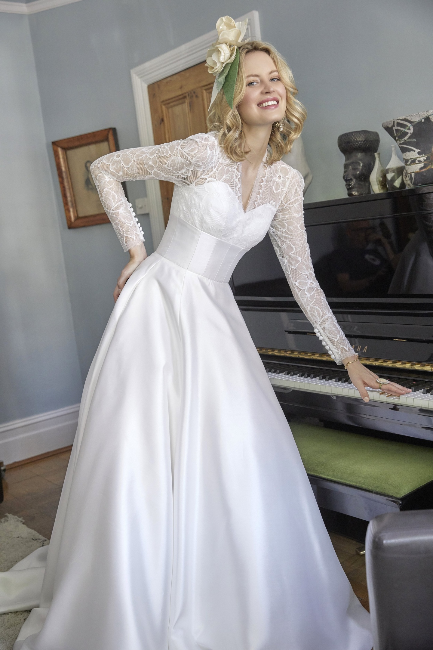 A classic soft satin, ballgown wedding dress featuring a structured bodice with clinched waist and a delicate lace overlay with full sleeves.