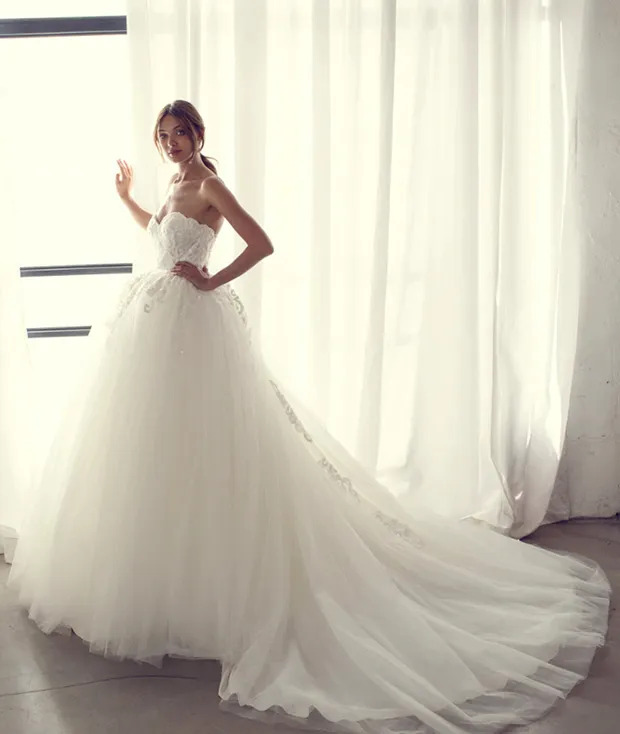 A lightweight, strapless ballgown wedding dress featuring delicate lace appliques and 3D flower accents.