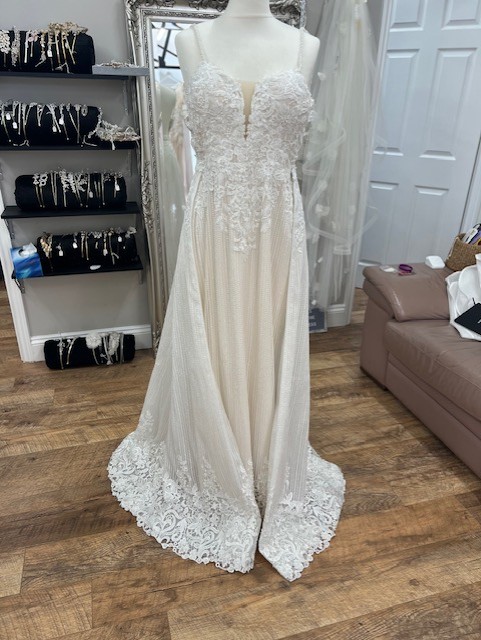 A classic A-line wedding dress with incredible beaded detail; silver embroidered trailing flowers and vines with pearls, crystals and sequins. With straps, a V-cut neck and illusion back.