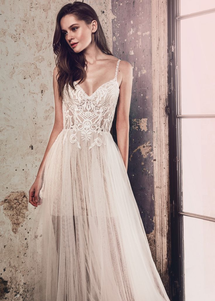 A light, sheath style wedding dress featuring a beaded plunge bodice, shoestring straps and a subtle underlay of shimmer tulle.