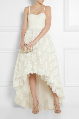A classic tulle tea length wedding dress featuring a lace overlay to the sweetheart bodice and scattering of lace appliques to the skirt.