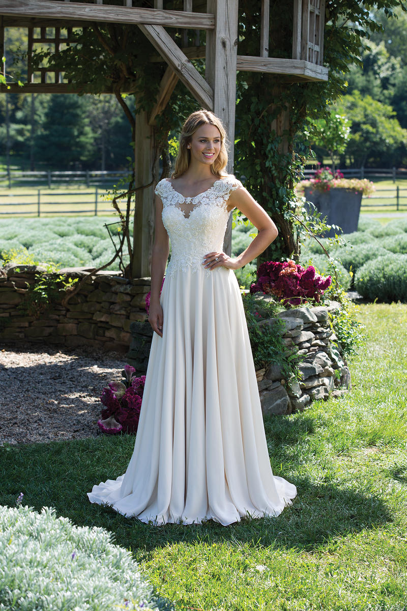 An lightweight A-line wedding dress featuring a sheer bodice with floral lace and cap sleeves, a V-back and no train.