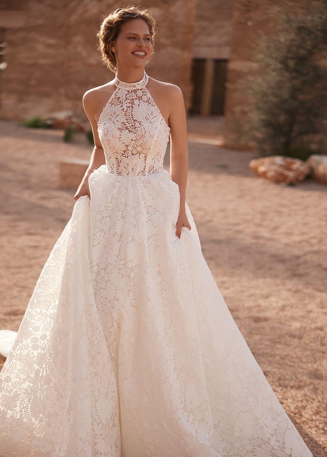 A graphic floral lace, A-line wedding dress featuring a semi sheer bodice with halter neck, sheer corset back detail and a full skirt.