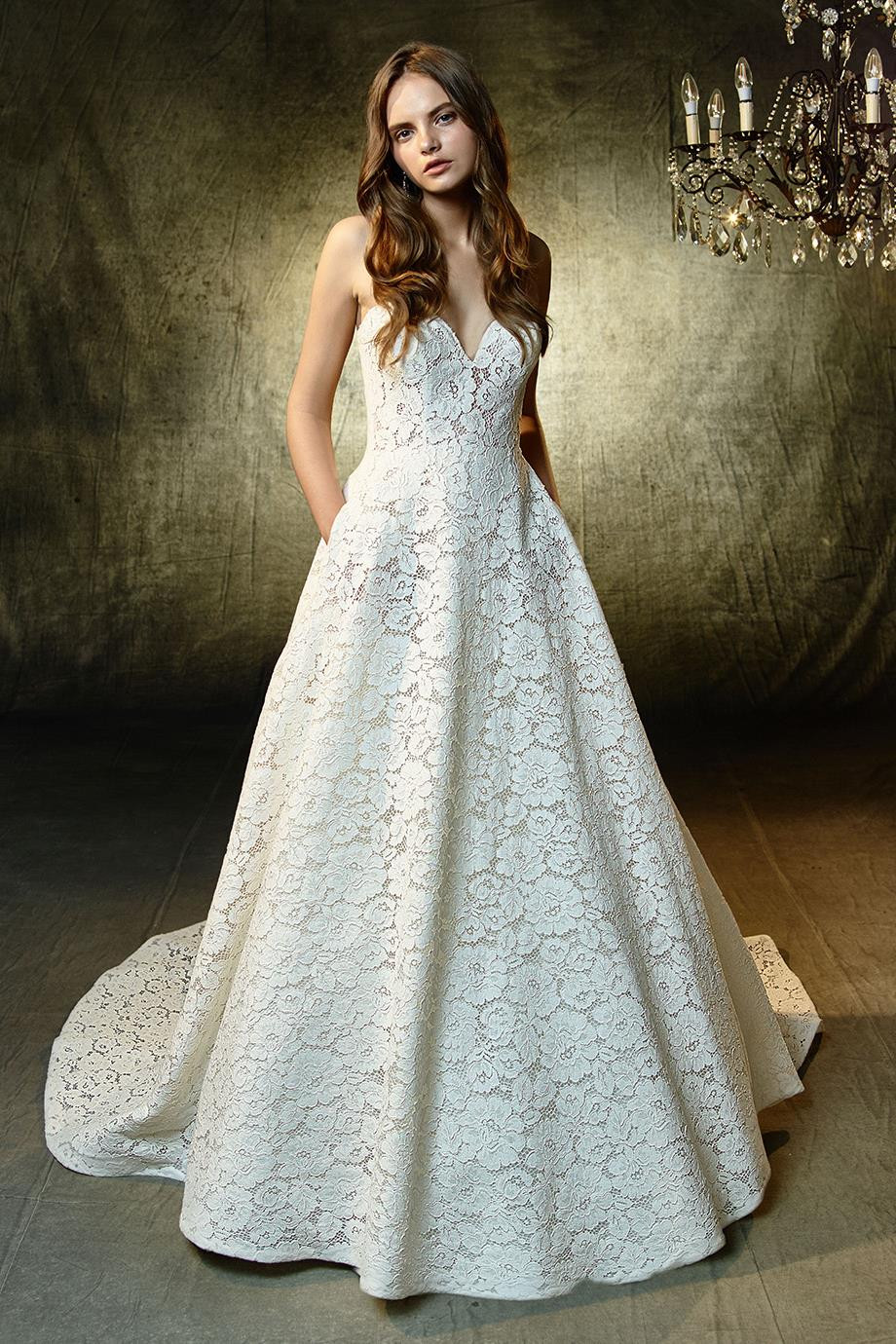 A classic, strapless, A-line, lightweight Alencon lace wedding wedding dress with a plunging sweetheart neckline.