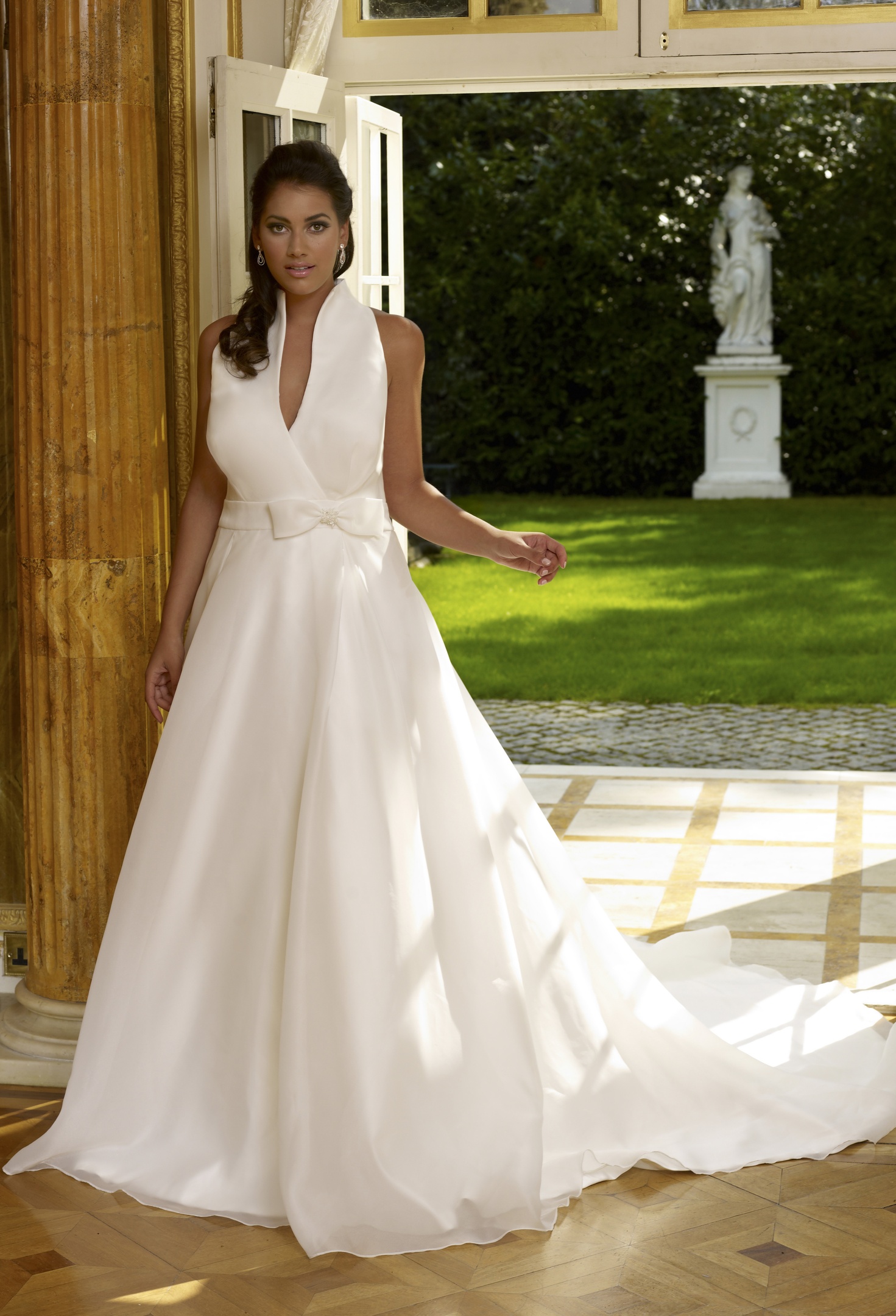 A classic mikado satin ballgown style wedding dress featuring a jewelled trim to the V-neck, wide waistband and V-cut back.