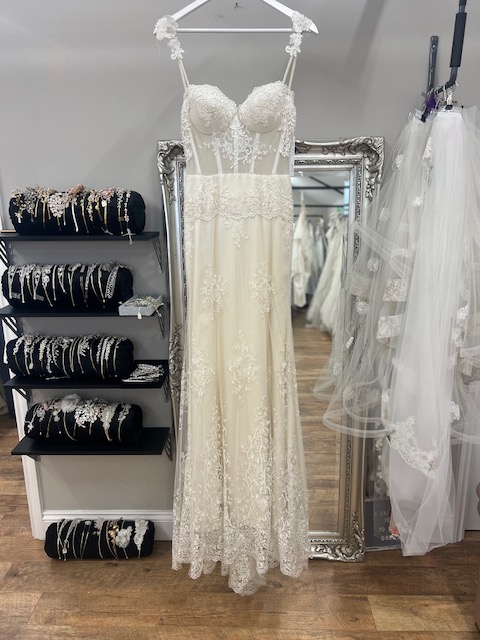 A slim fitting lace wedding dress featuring a sheer bodice with exposed corset boding, an illusion overlay and delicate lace straps.
