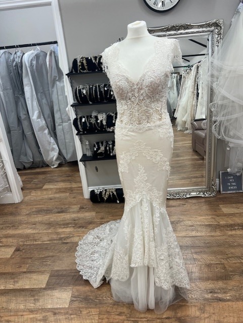 An beautiful fishtail wedding dress featuring an exposed boned corset bodice, delicate straps and beautiful lace train.