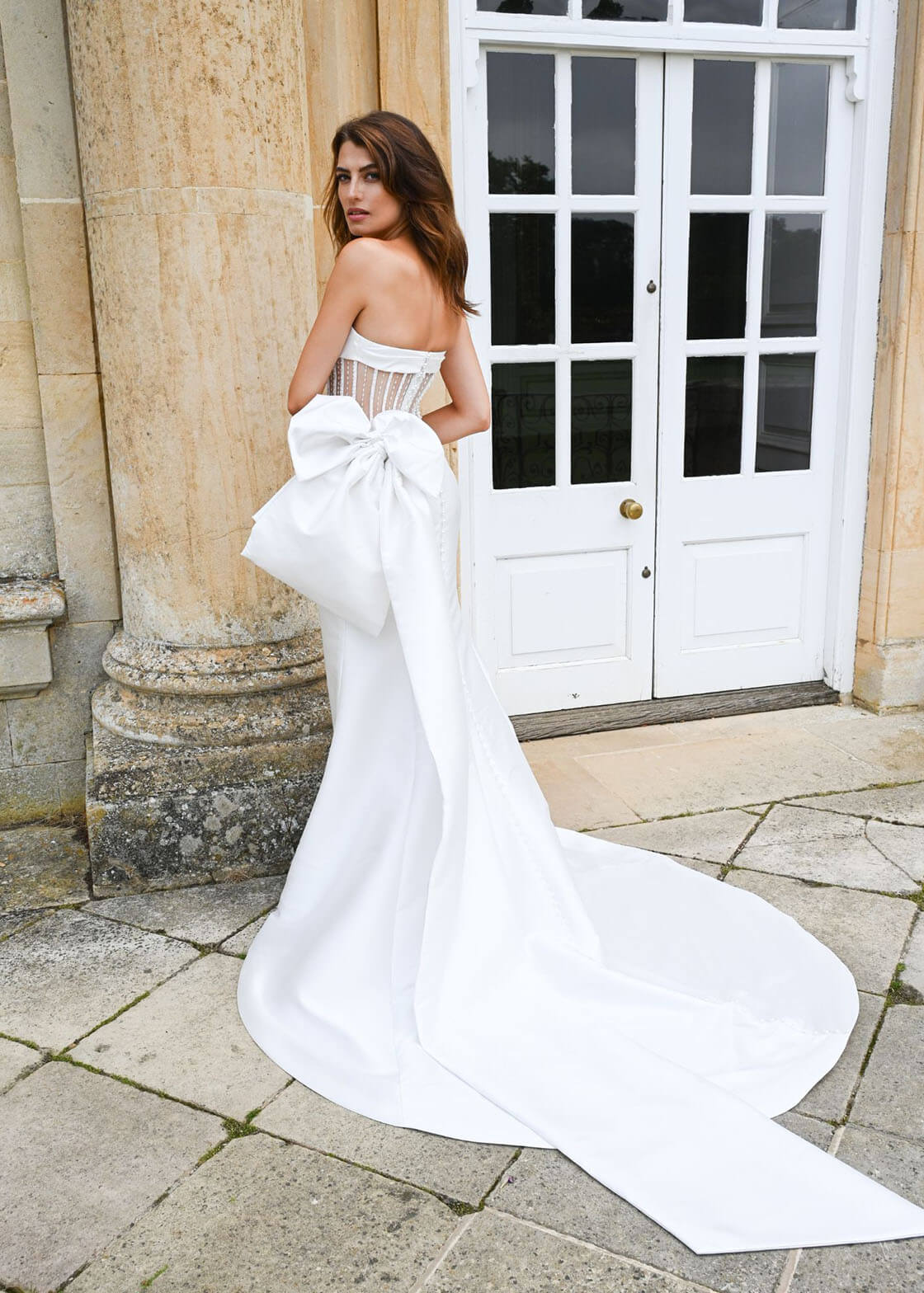 An elegant, crepe fit and flare strapless wedding dress with deep plunge to the neckline, defined corset detail to the bodice andsheer beaded detail.
