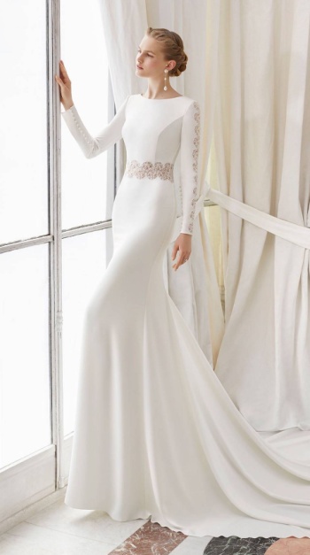 A beautiful crepe sheath style wedding dress featuring a boat neck, full sleeves, V-cut back, a touch of sheer lace to the waist, sleeves and back and a dramatic full train.